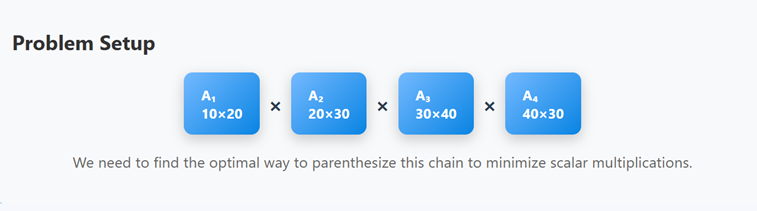 Matrix chain multiplication is a classic dynamic programming problem [Corman22, Das19, Mount]. It aims to determine the most efficient method for multiplying a sequence of matrices. Since matrix multiplication is associative, the order of grouping does not affect the result. However, the number of scalar multiplications involved can vary depending on the grouping.