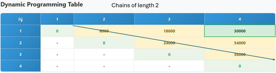 We approach this by using bottom-up dynamic programming, i.e., solving the smallest subproblems first. Consequently, we work over chains of increasing length, finding their optimal split position and minimum cost. For each chain, we calculate the cost at each possible split point and then identify the optimal split point. We store the optimal costs of each chain (subsequence) in a square matrix, where the row and column indices define the start and end points of the chain, respectively. This enables us to retrieve the optimal costs for both left and right chains, avoiding recalculation. We use an additional array, the split matrix, to store the optimal split position for each chain. Figure 3 shows the dynamic programming matrix.