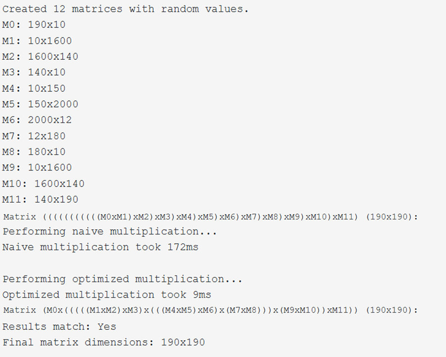 This example creates a chain of twelve matrices. It performs both a naïve (in declaration order) matrix chain evaluation and an optimised multiplication, recording the times taken to calculate the results.
