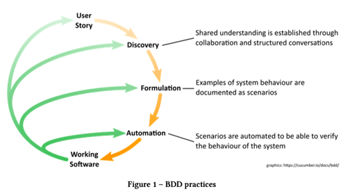 Behavior Driven Development (BDD) is an agile approach to software development that closes the gap between business people and technical people. BDD emphasizes the collaboration needed to create and maintain linkage between requirements, documentation, tests and the system being developed. It is made up of three practices, shown in Figure 1, which illustrates the order that the BDD practices should be applied to iteratively ‘drive out’ each small increment of functionality in your application.
