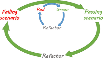| The BDD cycle is the outer loop – write a failing scenario, get the scenario to pass, then refactor. We enter the inner, TDD cycle to implement the code needed to move from a failing scenario to a passing scenario. |