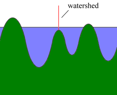 Imagine poking holes in the landscape at each of its regional minima, then lowering the landscape slowly into a lake. As the water begins to rise, pools of water will gradually form at each of the minima (see Figure 4). For reasons which will become obvious later, we'll call each pool of water the catchment basin of its associated minimum. If the water keeps rising, eventually some of the catchment basins will meet (see Figure 5): at this point, we imagine constructing a dam, or watershed , to keep them apart (see Figure 6) and continue the flooding. When the landscape has been fully flooded, the dams we've created will separate the different regional minima from each other at the points where their catchment basins would have met, thus segmenting the image into a number of regions, each associated with a different regional minimum (see Figure 7).
