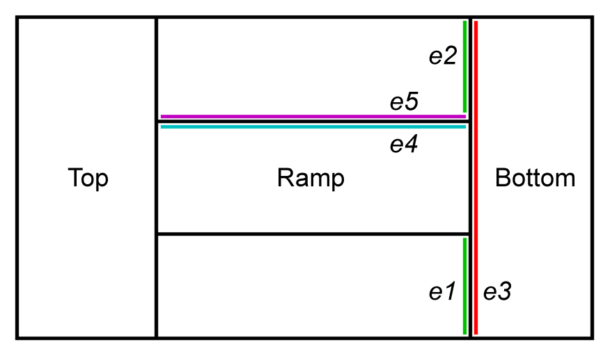 | An illustration of (part of) the edge plane table for the hesperus test level called Ramp: the ordered pairs of opposing edges are (e1,e3), (e2,e3), (e3,e1), (e3,e2), (e4,e5) and (e5,e4). The first four pairs will cause walk links to be created; the last two pairs will cause step links to be created. | |||||||||