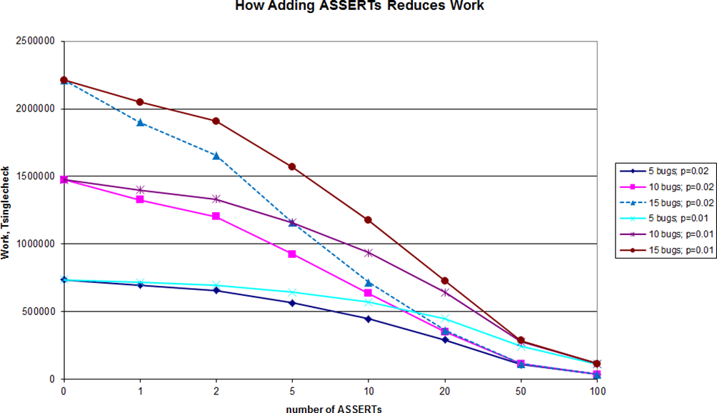 In ‘A Model for Debug Complexity’ [ Ignatchenko13 ], we started to build a mathematical model for estimating debugging efforts, and made some sanity checks of our model, in particular on relations between coupling and debug complexity. In this article, we have extended that model to see the effect of the assertions on debugging time. It should be noted that, as previously, the model should be considered to be very approximate, with several assumptions made about the nature of the code and debugging process (though we’re doing our best to outline these assumptions explicitly). Nonetheless, the relations observed within the results obtained look quite reasonable and interesting, which makes us hope that the model we’re working with represents a reasonable approximation of the real world.