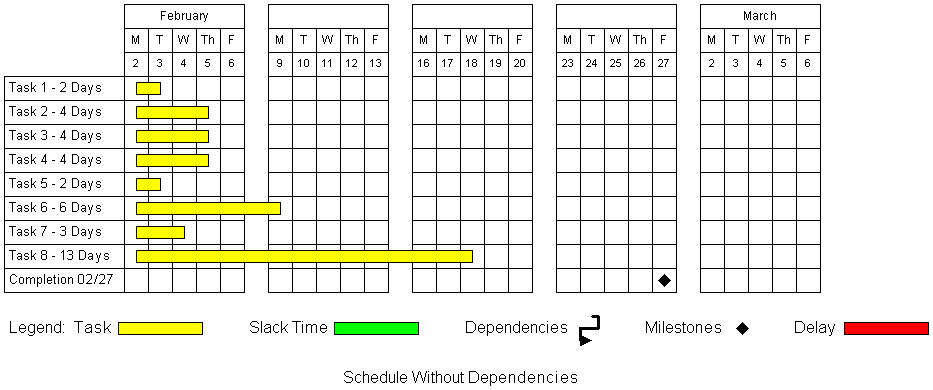 The format of the schedule in Figure 3, which is people-based, is much easier to follow than the one in Figure 2 (which contains the same data). It is also easier to detect an imbalance between the loadings of each of the team members, places where dependencies between team members cause slack time in one member’s schedule, and where the critical path lies.