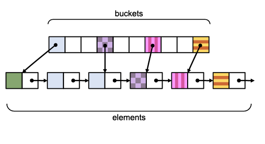 - Buckets point to the node before the first one in the bucket so as to preserve constant-time erasure.